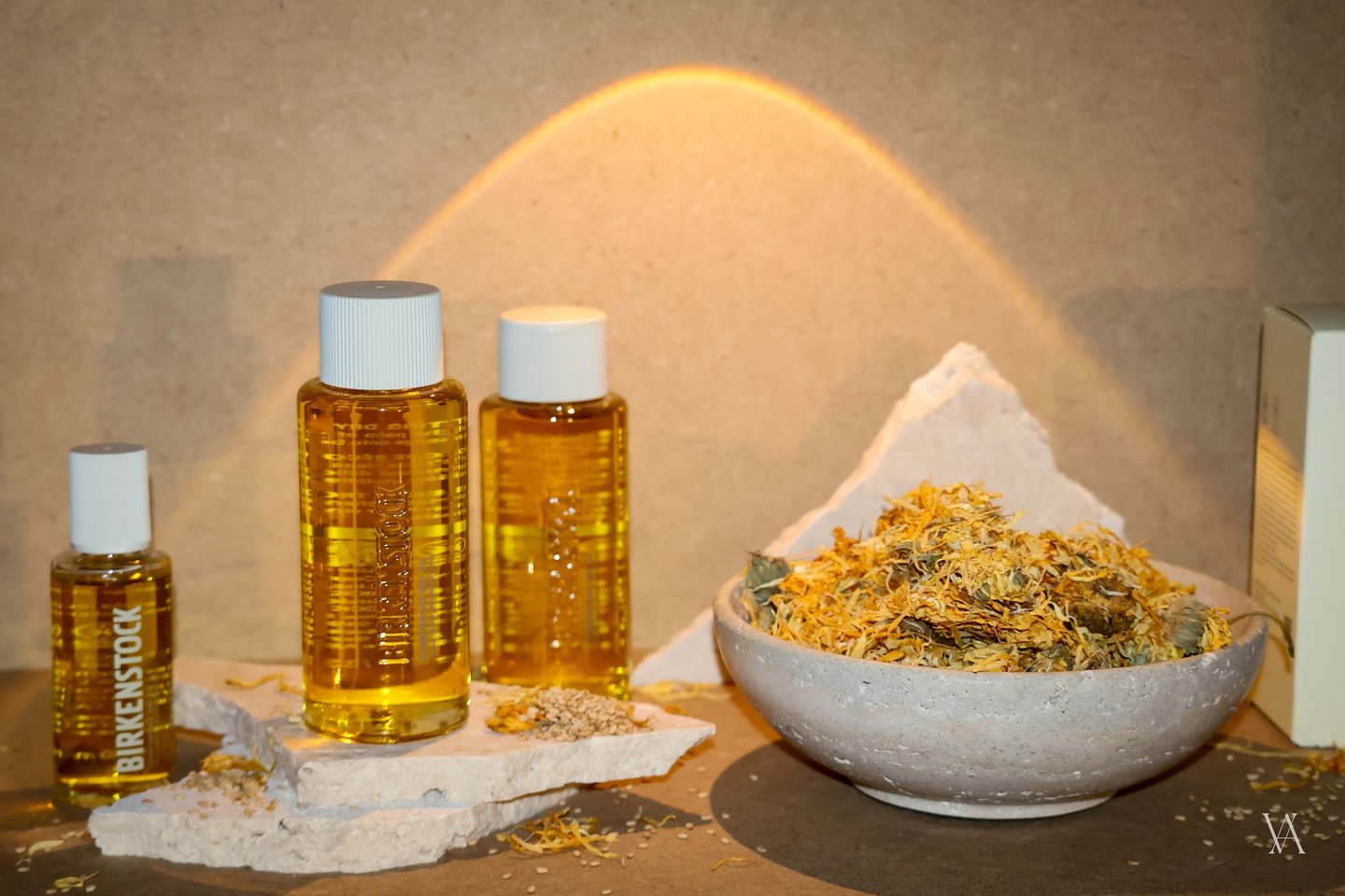 Les produits de la gamme Birkenstock care Essentials s’exposent aux côtés de leurs ingrédients actifs — menthe fraîche, cristaux de sel, grenade — dans une mise en scène à la fois sensorielle et narrative. Le produit entre en résonance avec sa matière première, et l’authenticité des formules dialogue avec l’esthétique de l’espace.