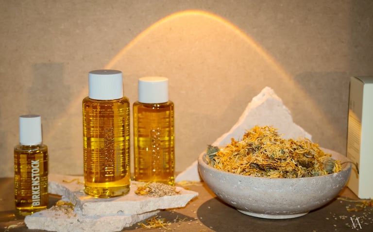 The Birkenstock Care Essentials products were displayed alongside their active ingredients — fresh mint, salt crystals, pomegranate — in a sensorial and narrative mise-en-scène.