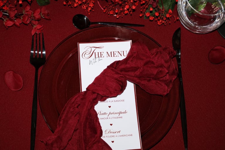 Red is everywhere—bold, radiant, intoxicating. It envelops the room like a heartbeat, pulsing to the rhythm of laughter and whispered confidences. Voluminous drapery, floral explosions, and dimmed lights: every detail tells a story—not just of love, but of friendship at its most vibrant.