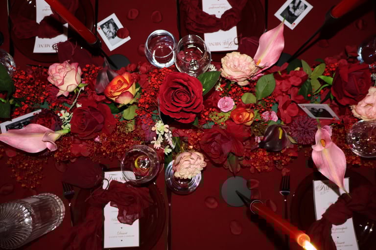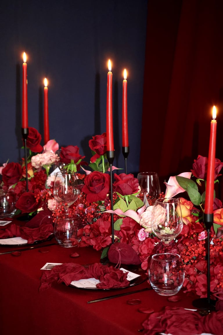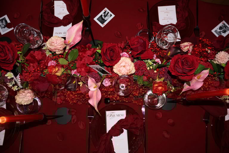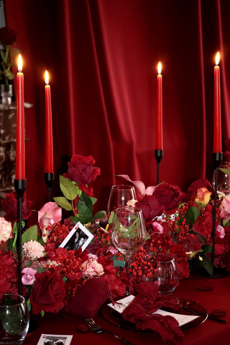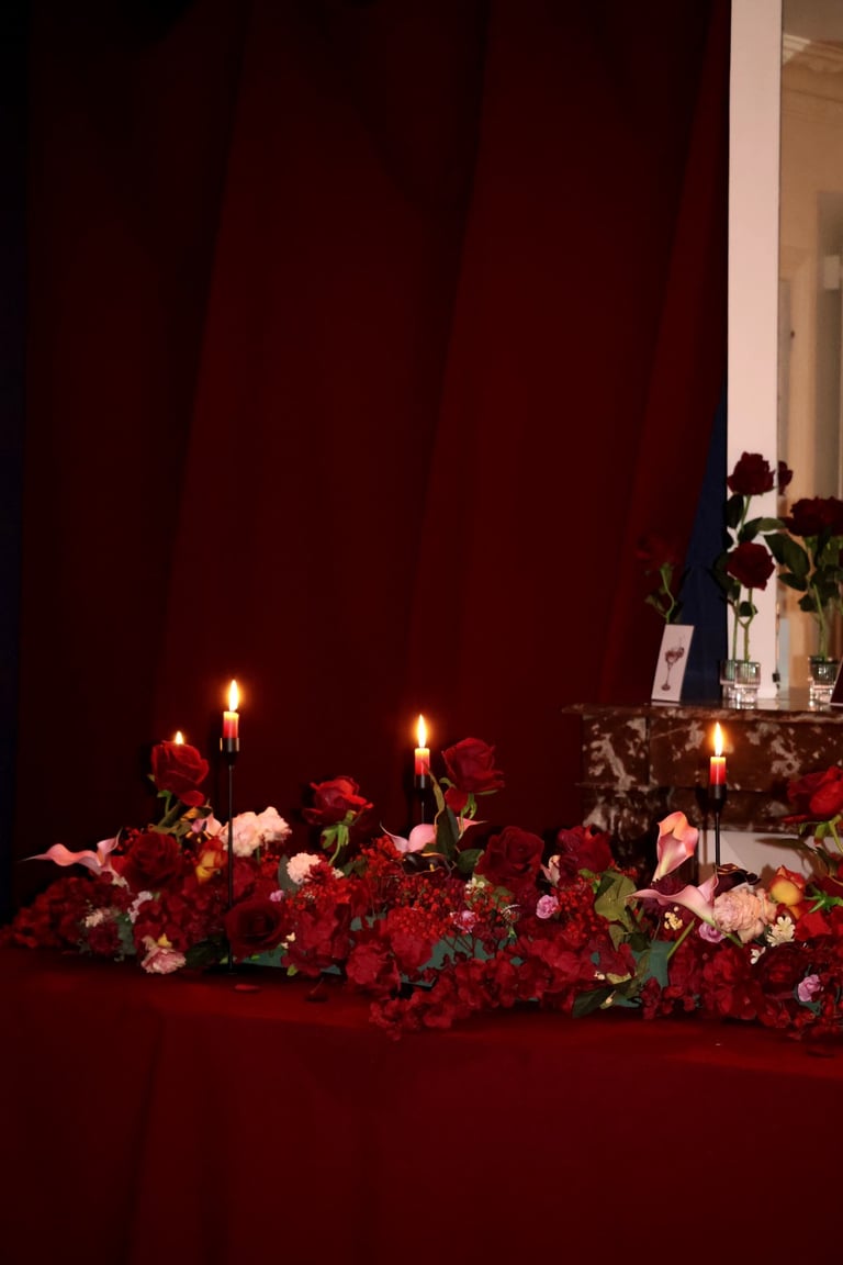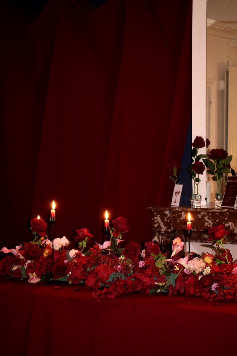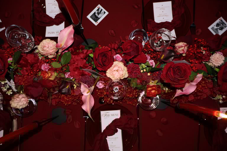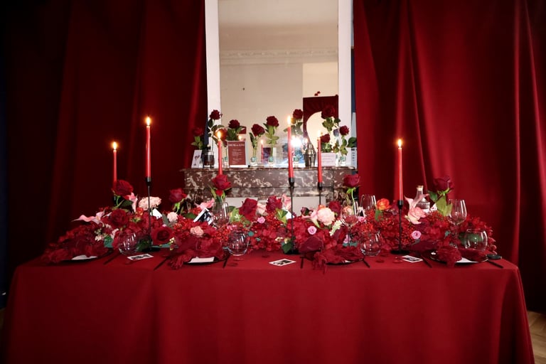 La table se fait jardin incandescent, un foisonnement de roses carmin et de pivoines délicates, où le rose poudré dépose un soupçon de tendresse. Les chandelles élancées dansent dans leur reflet de cristal, projetant une lumière douce, presque irréelle, comme pour suspendre le temps.