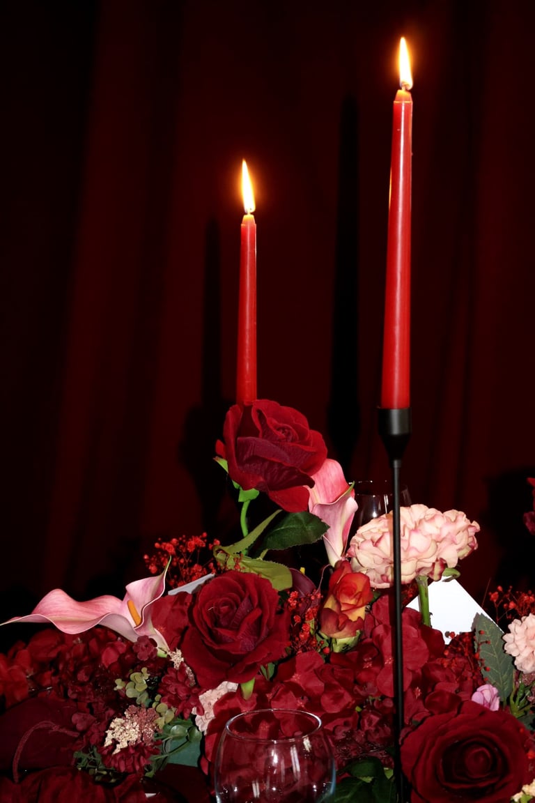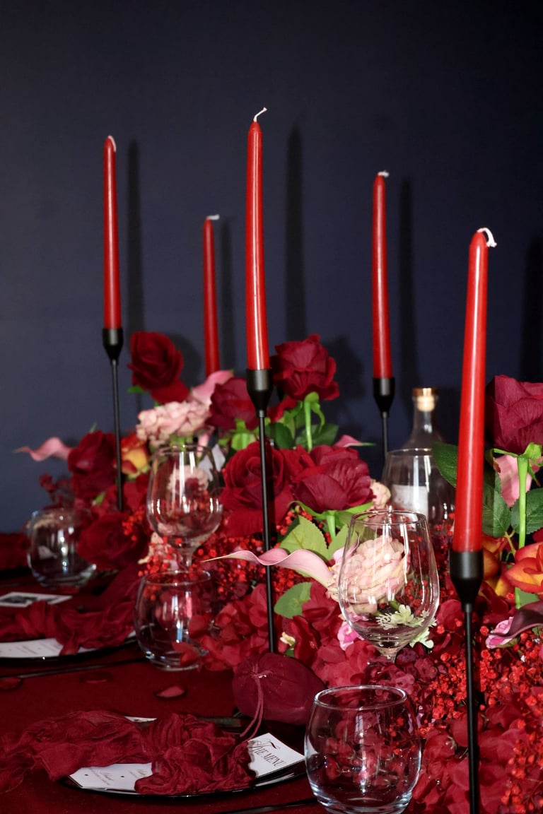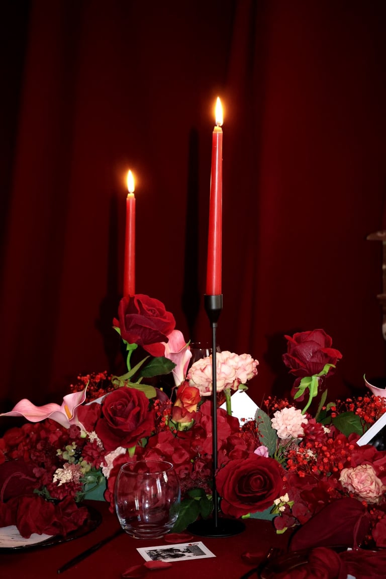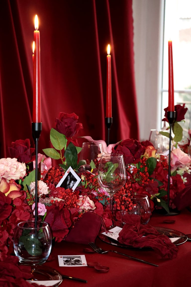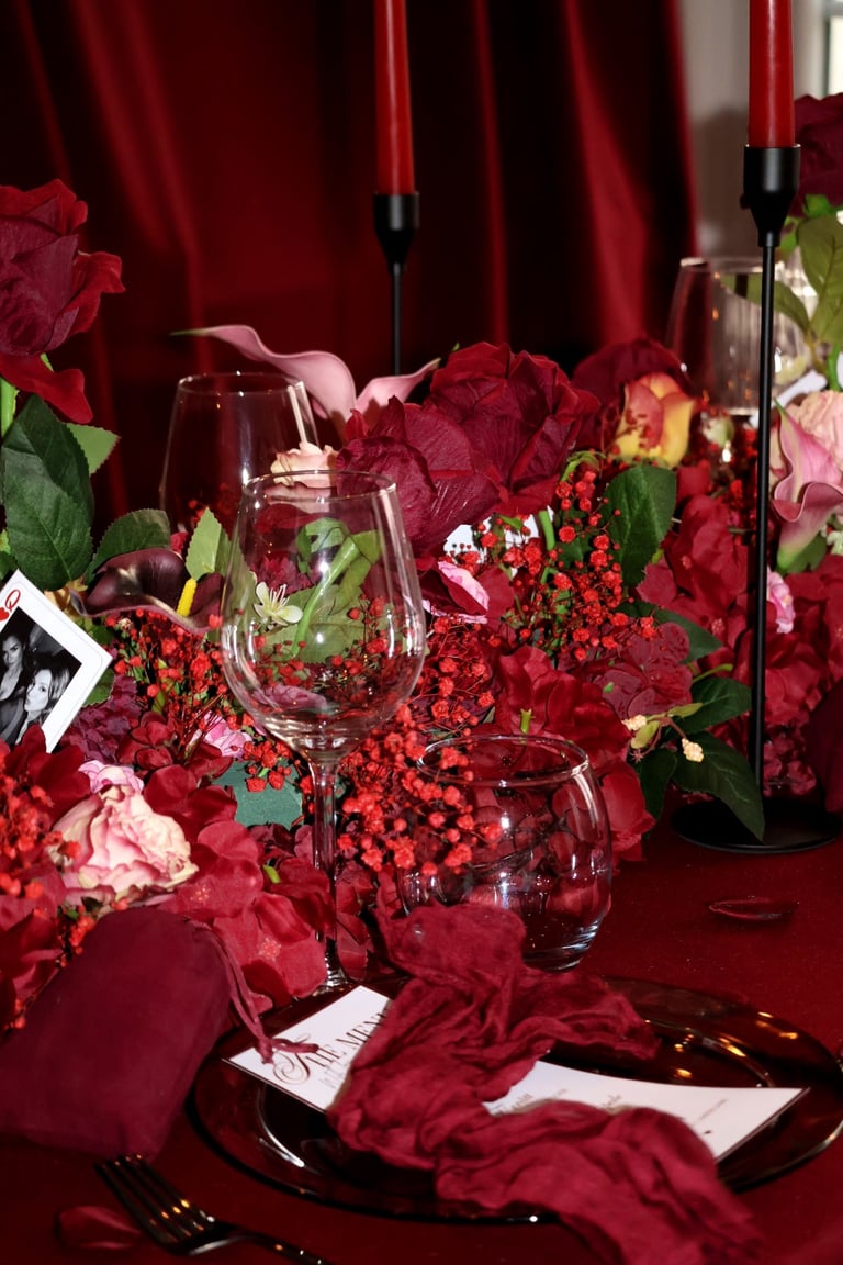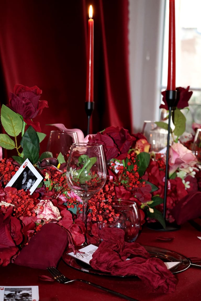 La table se fait jardin incandescent, un foisonnement de roses carmin et de pivoines délicates, où le rose poudré dépose un soupçon de tendresse. Les chandelles élancées dansent dans leur reflet de cristal, projetant une lumière douce, presque irréelle, comme pour suspendre le temps.