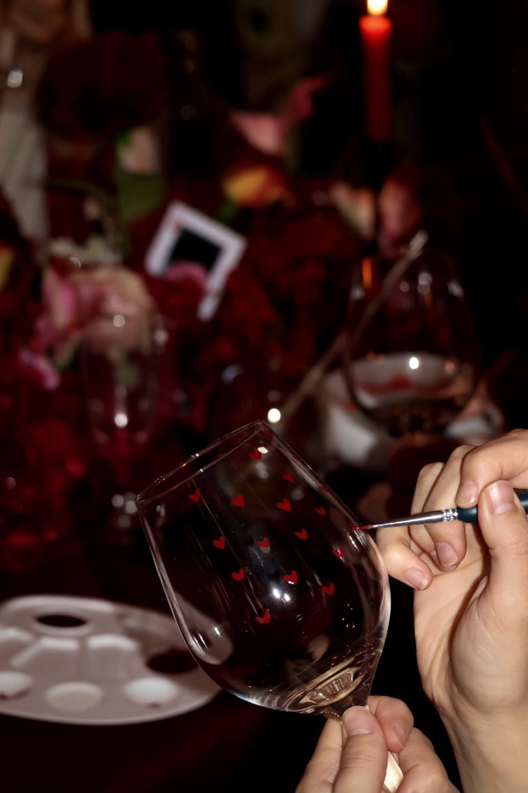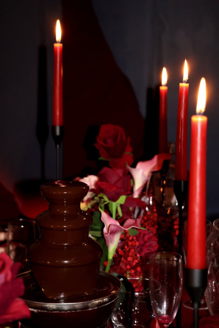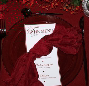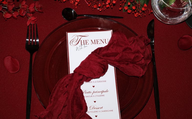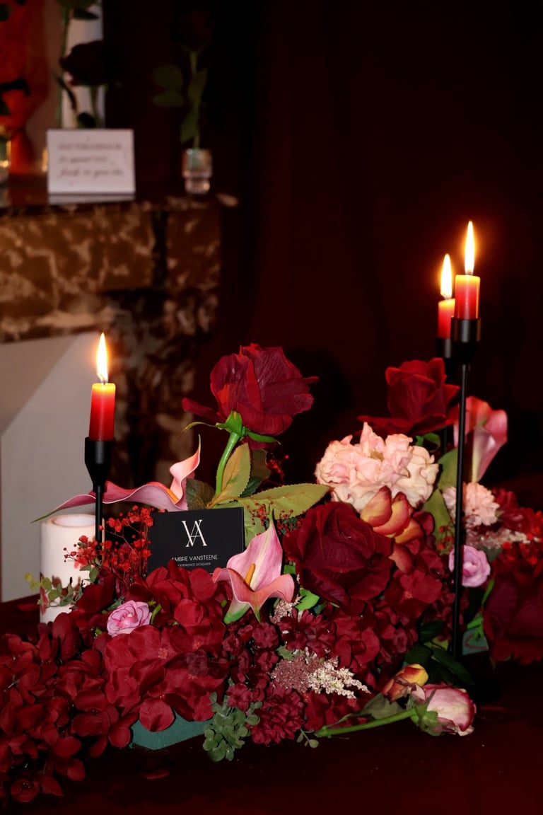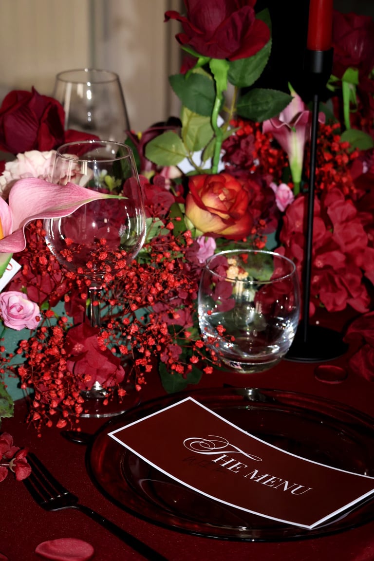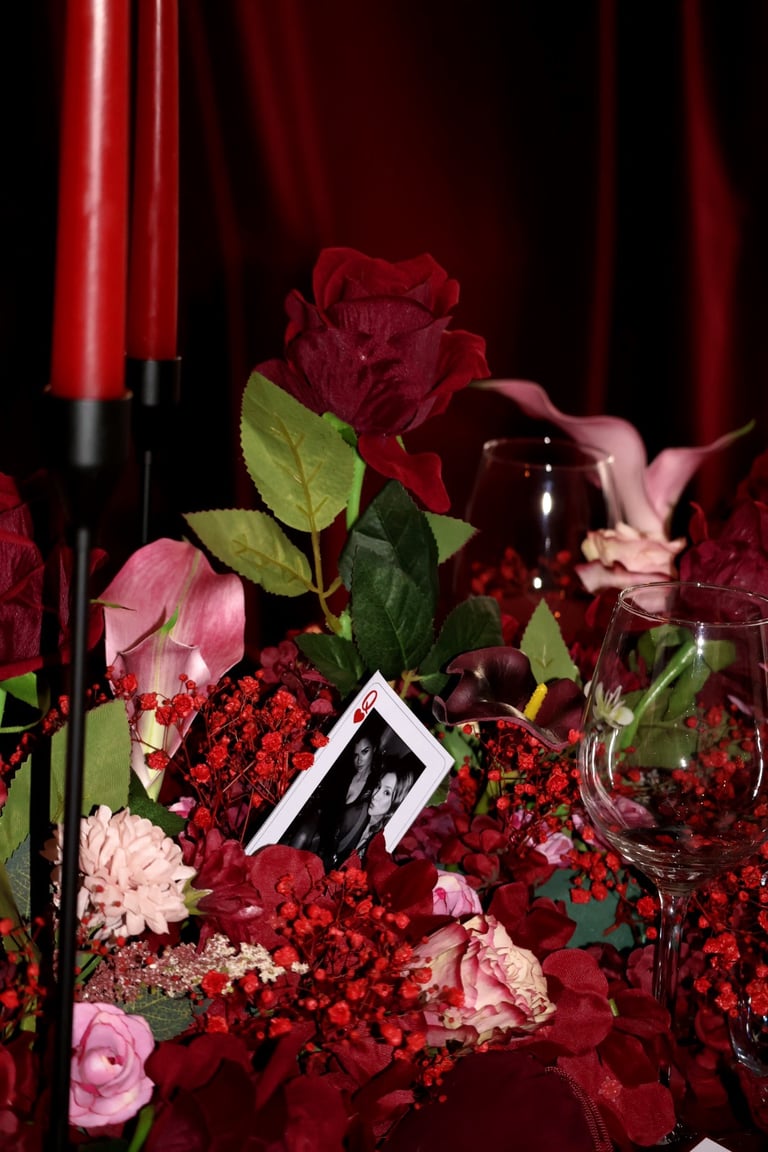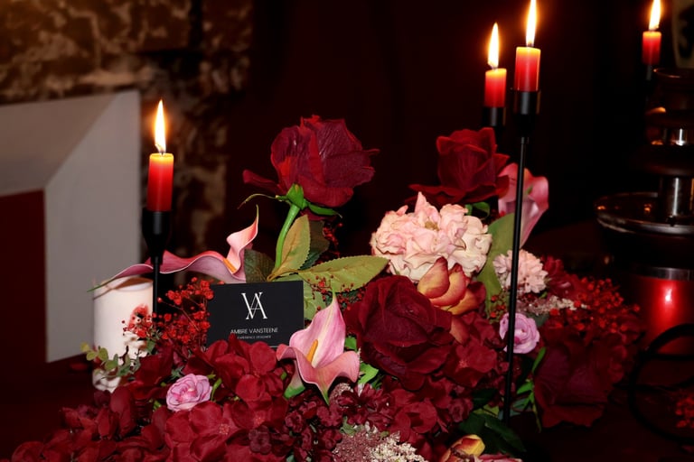 La table se fait jardin incandescent, un foisonnement de roses carmin et de pivoines délicates, où le rose poudré dépose un soupçon de tendresse. Les chandelles élancées dansent dans leur reflet de cristal, projetant une lumière douce, presque irréelle, comme pour suspendre le temps.