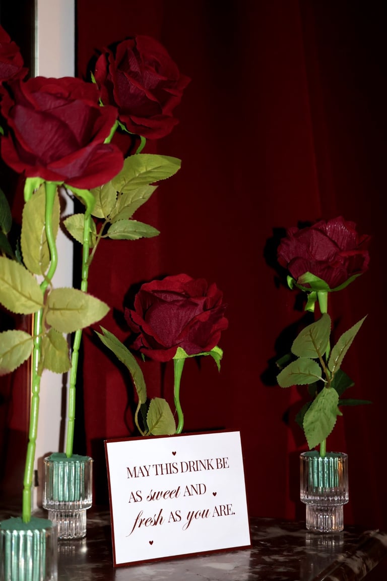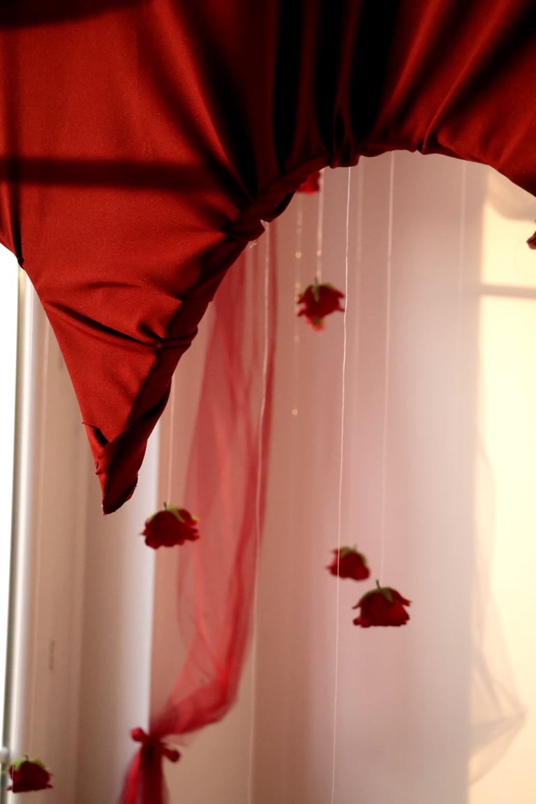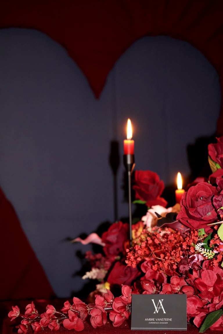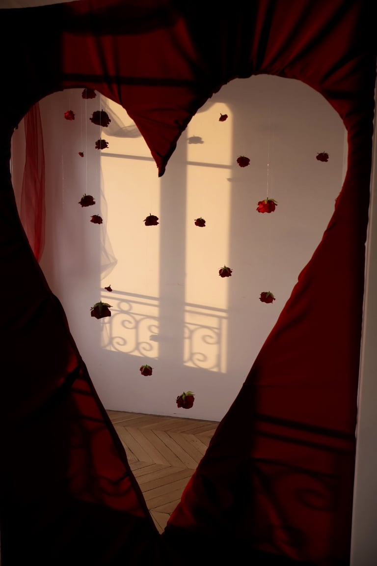 Et puis, au cœur du salon, une œuvre vivante : un immense cœur drapé de velours rouge, battant au centre de la pièce, comme une invitation à l’émotion. Autour de lui, une pluie de roses suspendues, légères et insaisissables, flottant dans l’air comme des promesses murmurées.