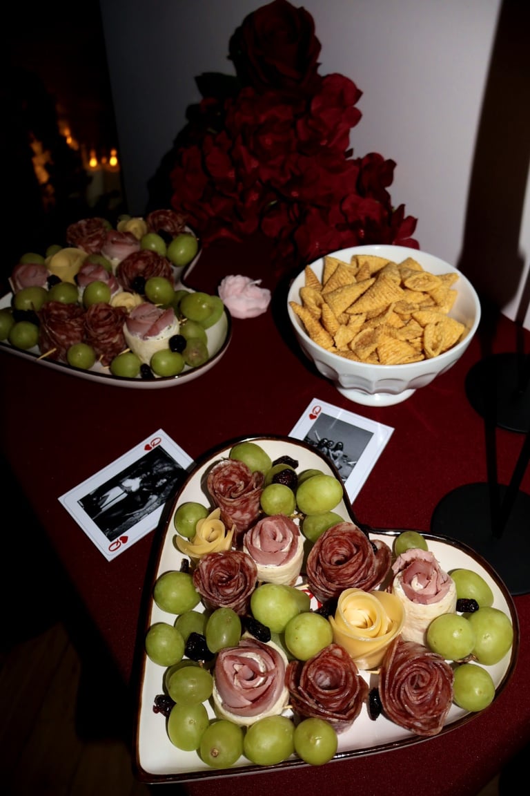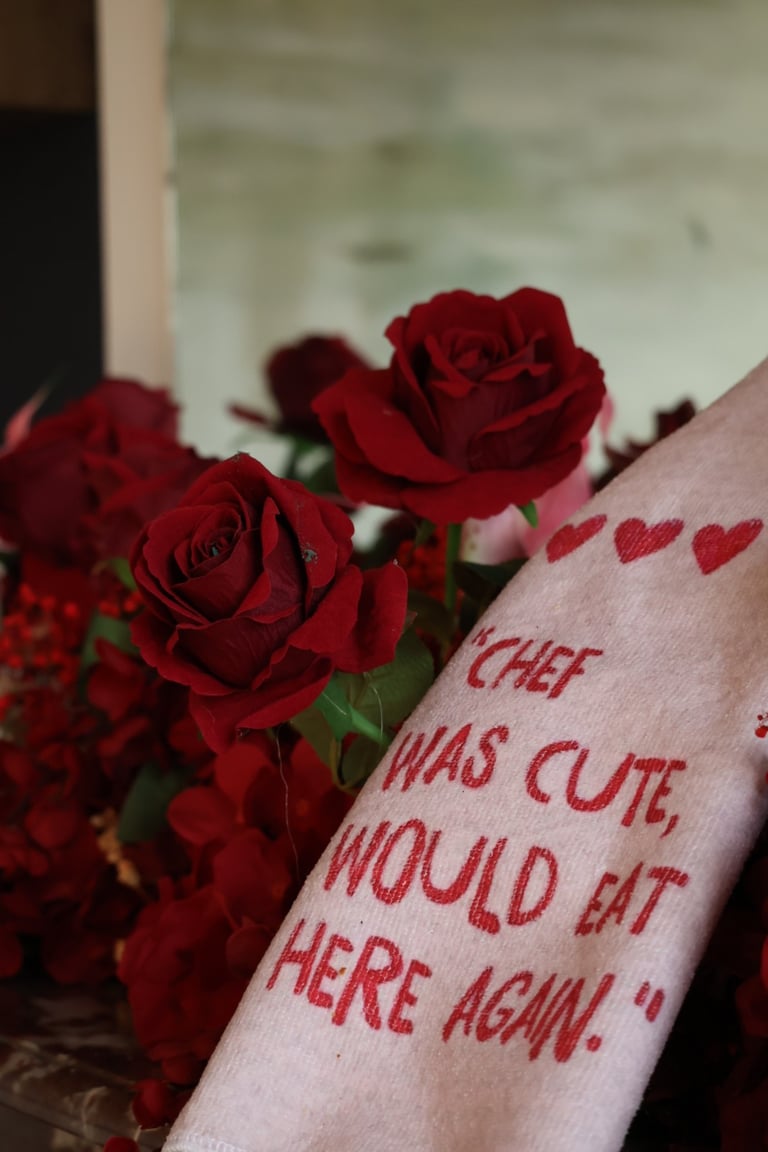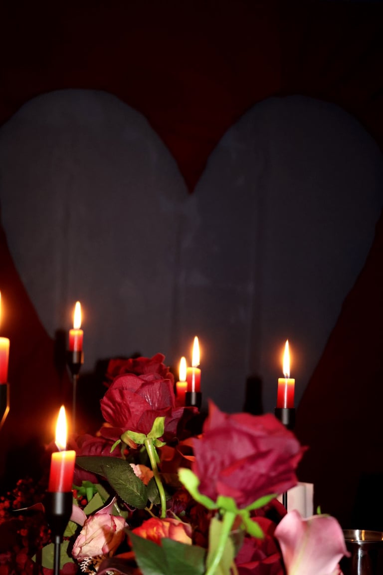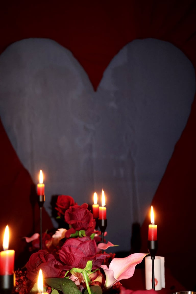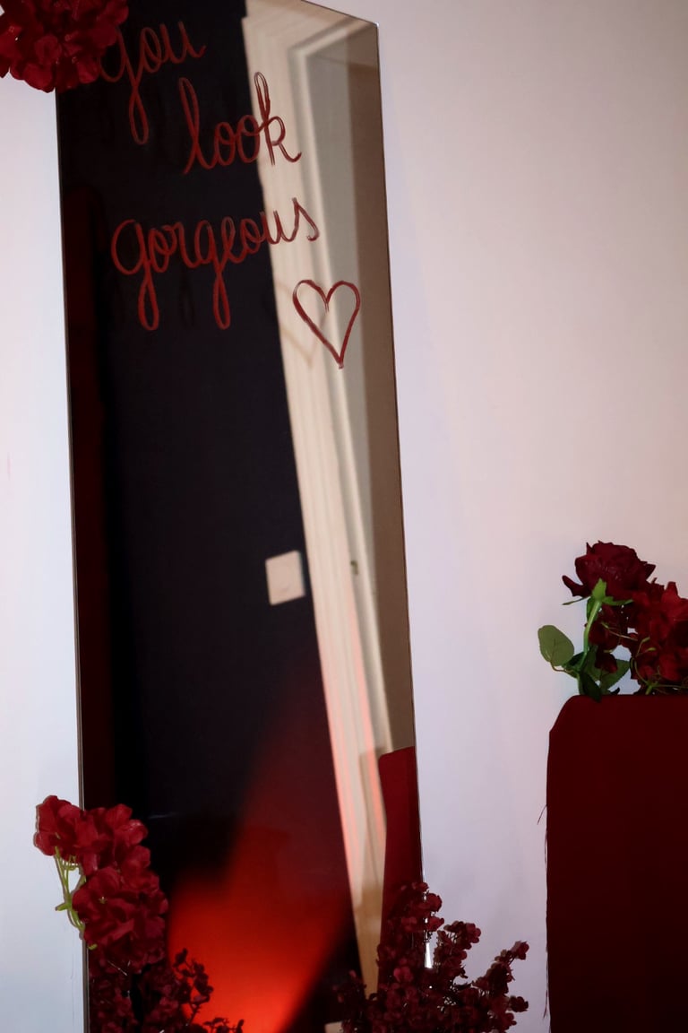 Et puis, au cœur du salon, une œuvre vivante : un immense cœur drapé de velours rouge, battant au centre de la pièce, comme une invitation à l’émotion. Autour de lui, une pluie de roses suspendues, légères et insaisissables, flottant dans l’air comme des promesses murmurées.