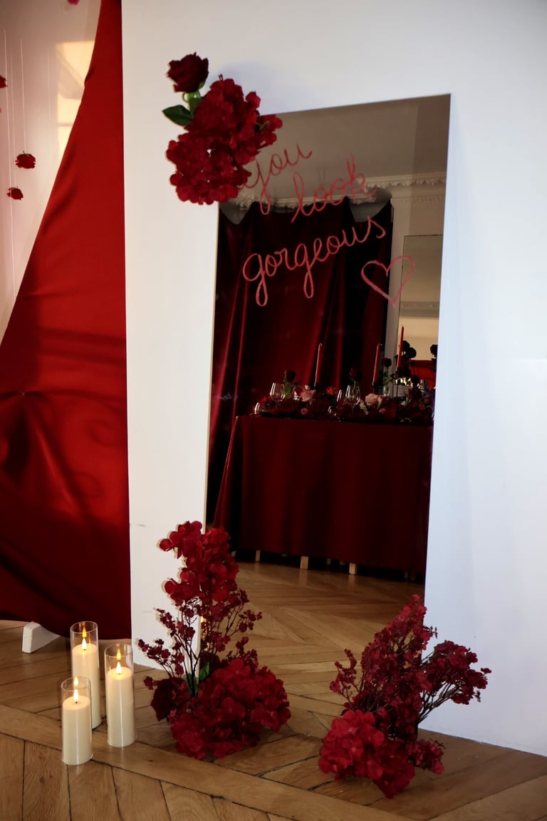 Le rouge s’invite partout, éclatant, audacieux, envoûtant. Il habille la pièce comme un battement de cœur, palpitant au rythme des éclats de rire et des confidences murmurées. Drapés voluptueux, éclats floraux, lueurs tamisées : chaque détail semble raconter une histoire, celle d’une passion qui ne se limite pas à l’amour, mais qui célèbre aussi l’amitié dans ce qu’elle a de plus vibrant.