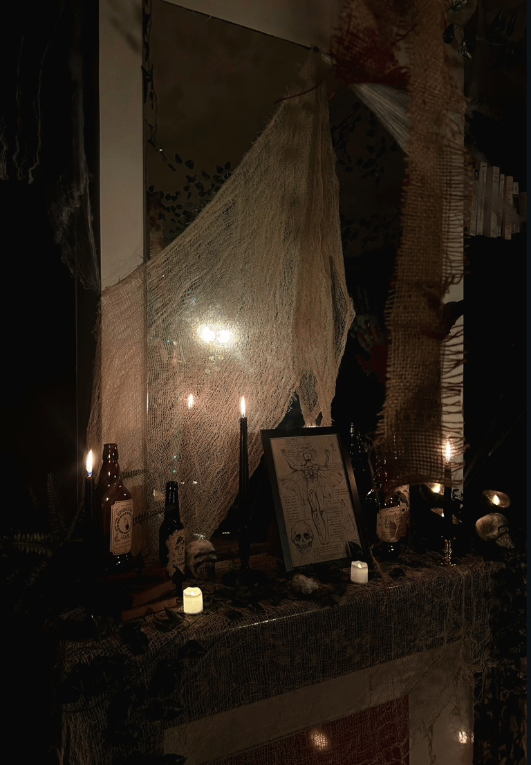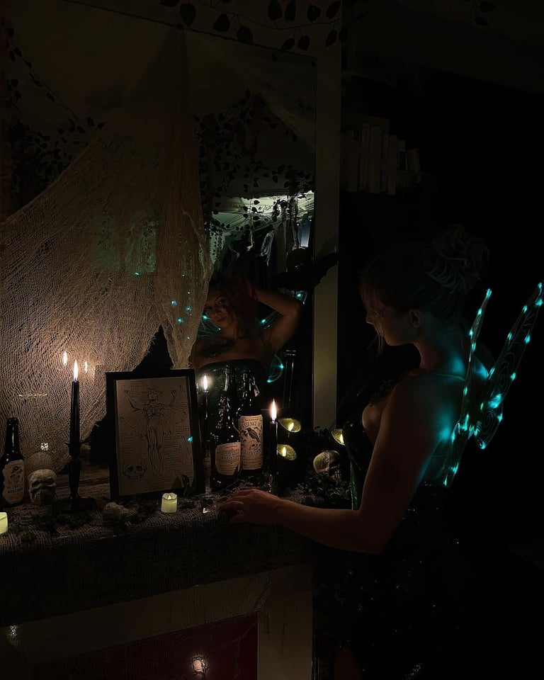 Ici, Clochette n’est plus la petite fée pétillante qui volait aux côtés de Peter Pan. Usée par des années de rejet et de solitude, elle a laissé la lumière s’éteindre pour embrasser les ténèbres. Avec une magie qu’elle seule maîtrise, elle a ramené la forêt dans ces murs clos, un sanctuaire où elle tisse sa revanche. Les arbres prennent racine entre les murs, leurs ombres se mouvant comme des spectres. Des fioles mystérieuses et des sortilèges inscrits à l’encre noire évoquent des pouvoirs obscurs.