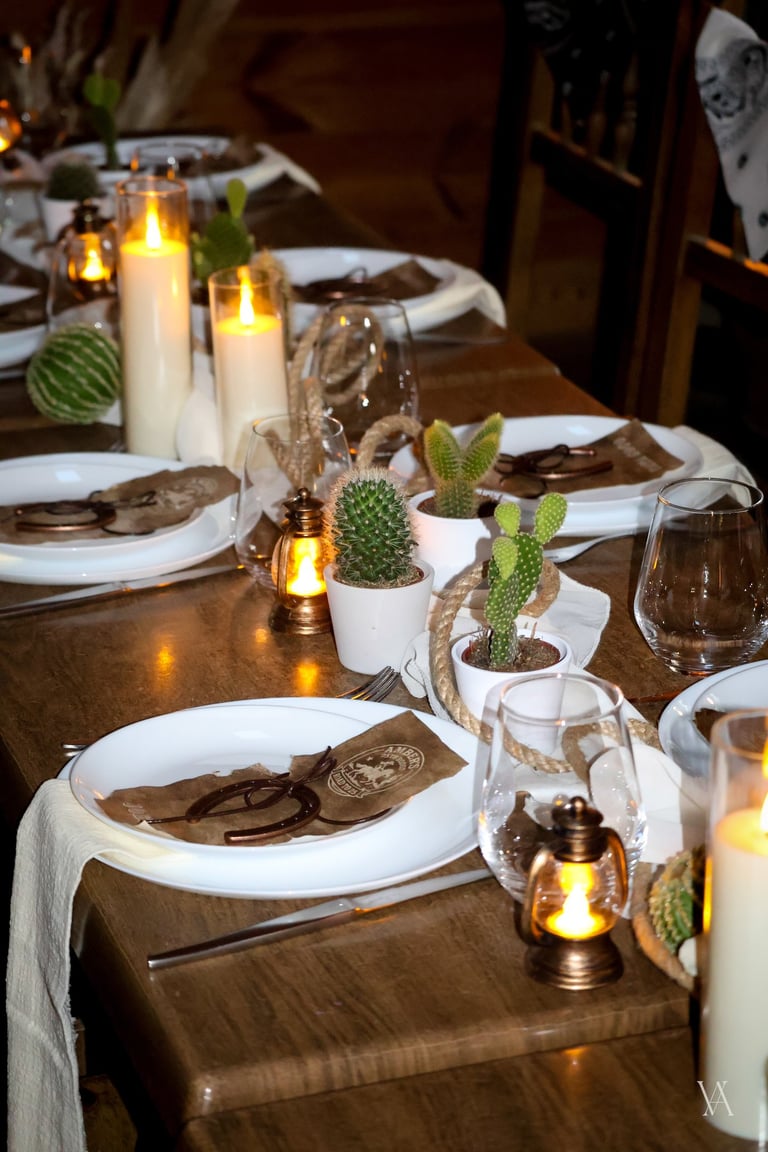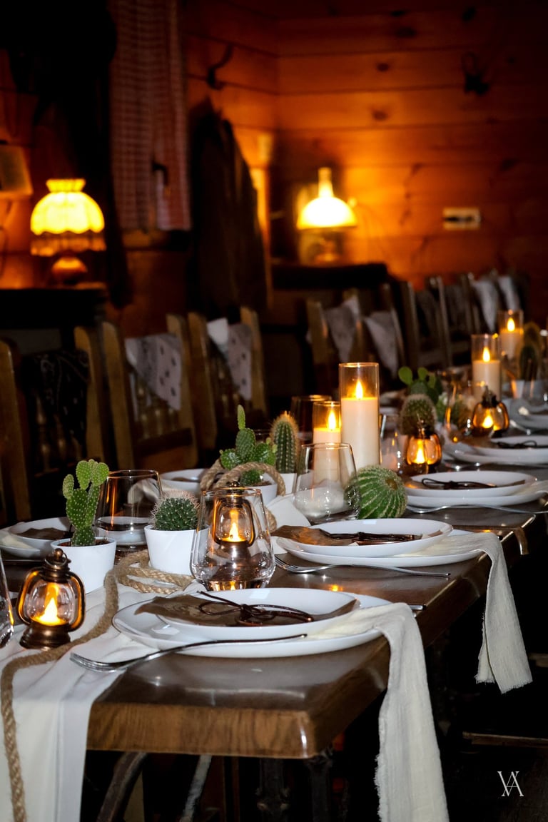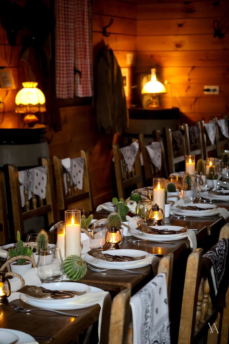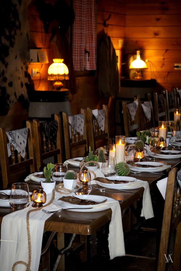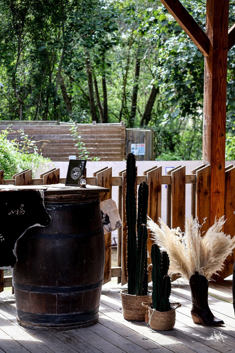 Autour du lieu, l’univers western se dévoile par touches : tonneaux, drapeaux, objets emblématiques et matières patinées évoquent l’esprit des grandes plainesAu centre, une longue tablée rassemble cactus, lassos, fers à cheval et lampes à huile. Les bougies viennent adoucir les lignes rustiques du décor, apportant une lumière chaude qui équilibre la force des matières. Concert de musique country, rodéo, lancer de lasso ou tir, l’expérience se prolonge naturellement dans les saveurs et les animations, pensées pour contribuer à transformer le lieu en un véritable décor vivant, où les invités plongent le temps d’un week end.