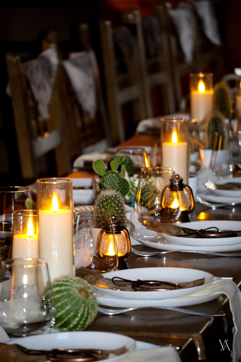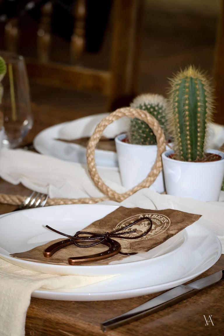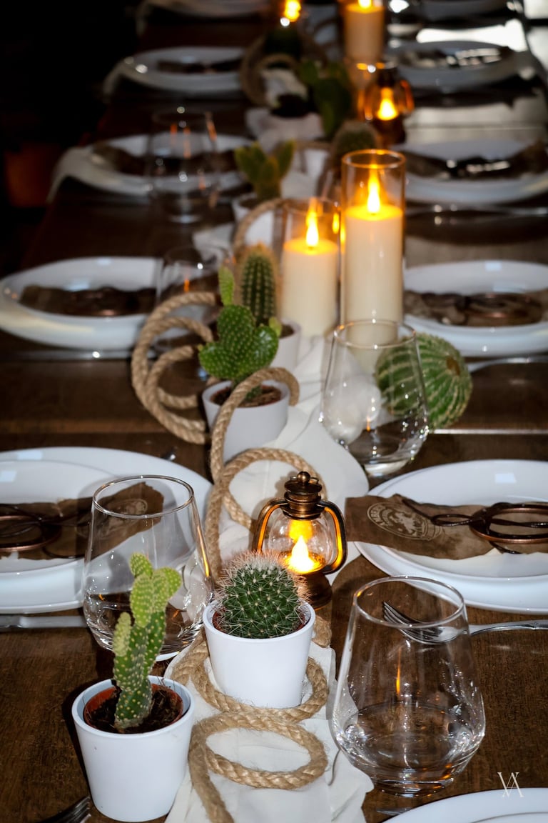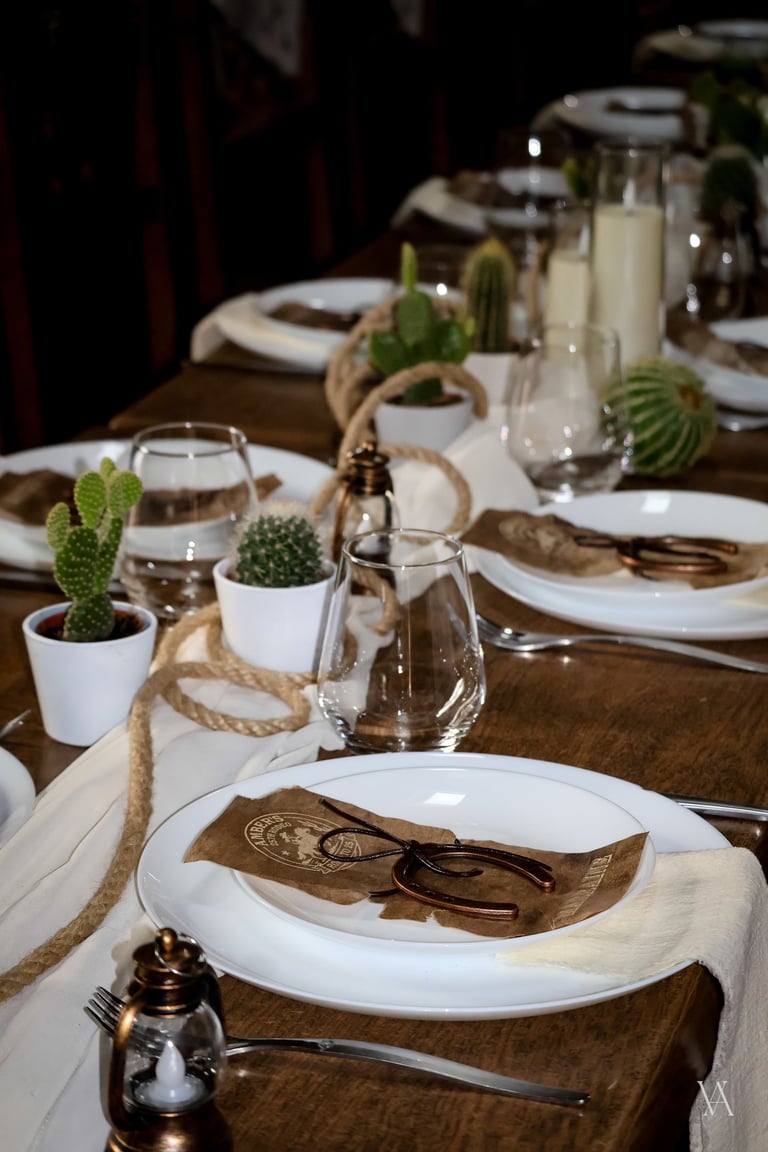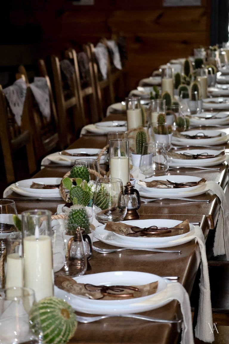 Autour du lieu, l’univers western se dévoile par touches : tonneaux, drapeaux, objets emblématiques et matières patinées évoquent l’esprit des grandes plainesAu centre, une longue tablée rassemble cactus, lassos, fers à cheval et lampes à huile. Les bougies viennent adoucir les lignes rustiques du décor, apportant une lumière chaude qui équilibre la force des matières. Concert de musique country, rodéo, lancer de lasso ou tir, l’expérience se prolonge naturellement dans les saveurs et les animations, pensées pour contribuer à transformer le lieu en un véritable décor vivant, où les invités plongent le temps d’un week end.