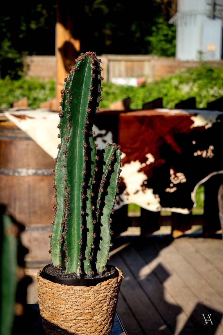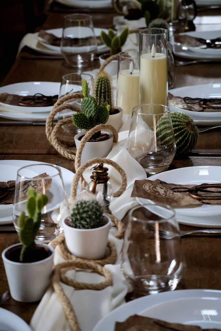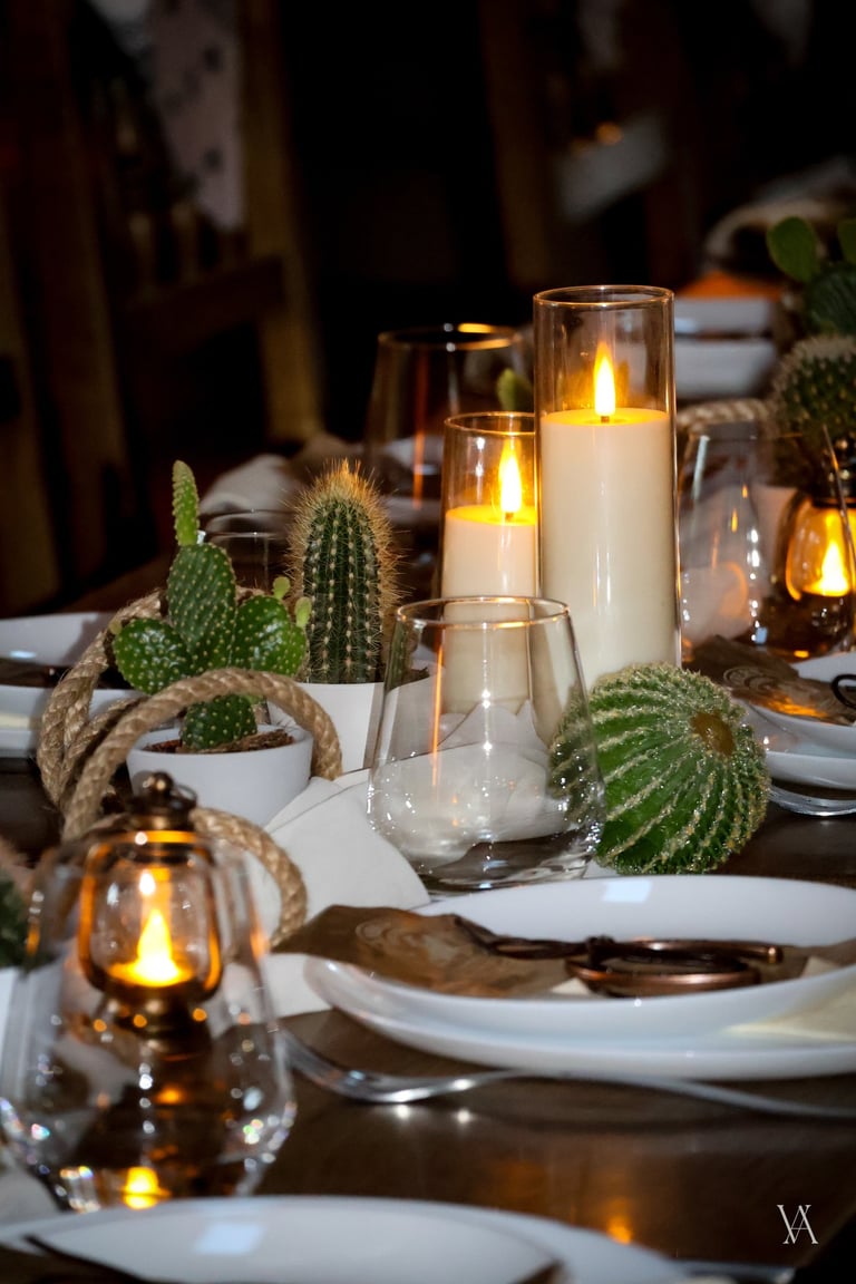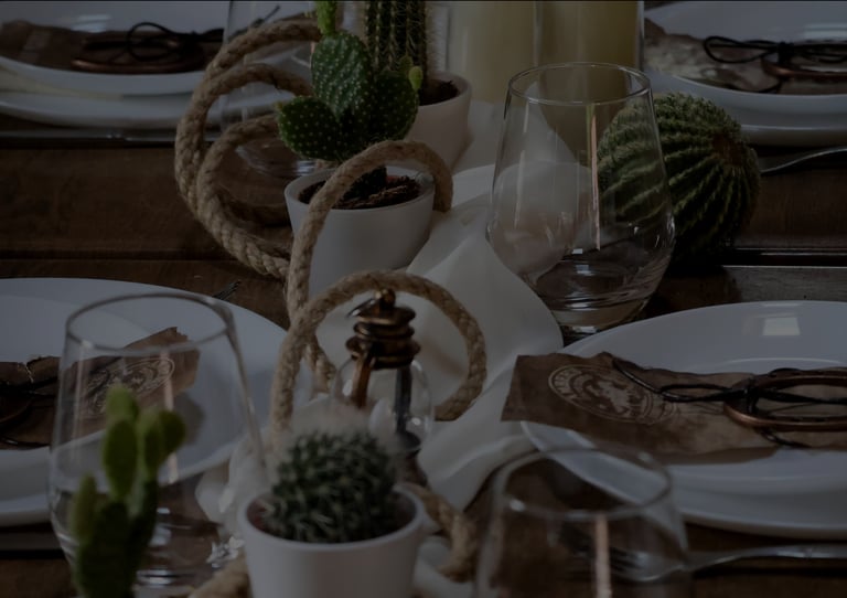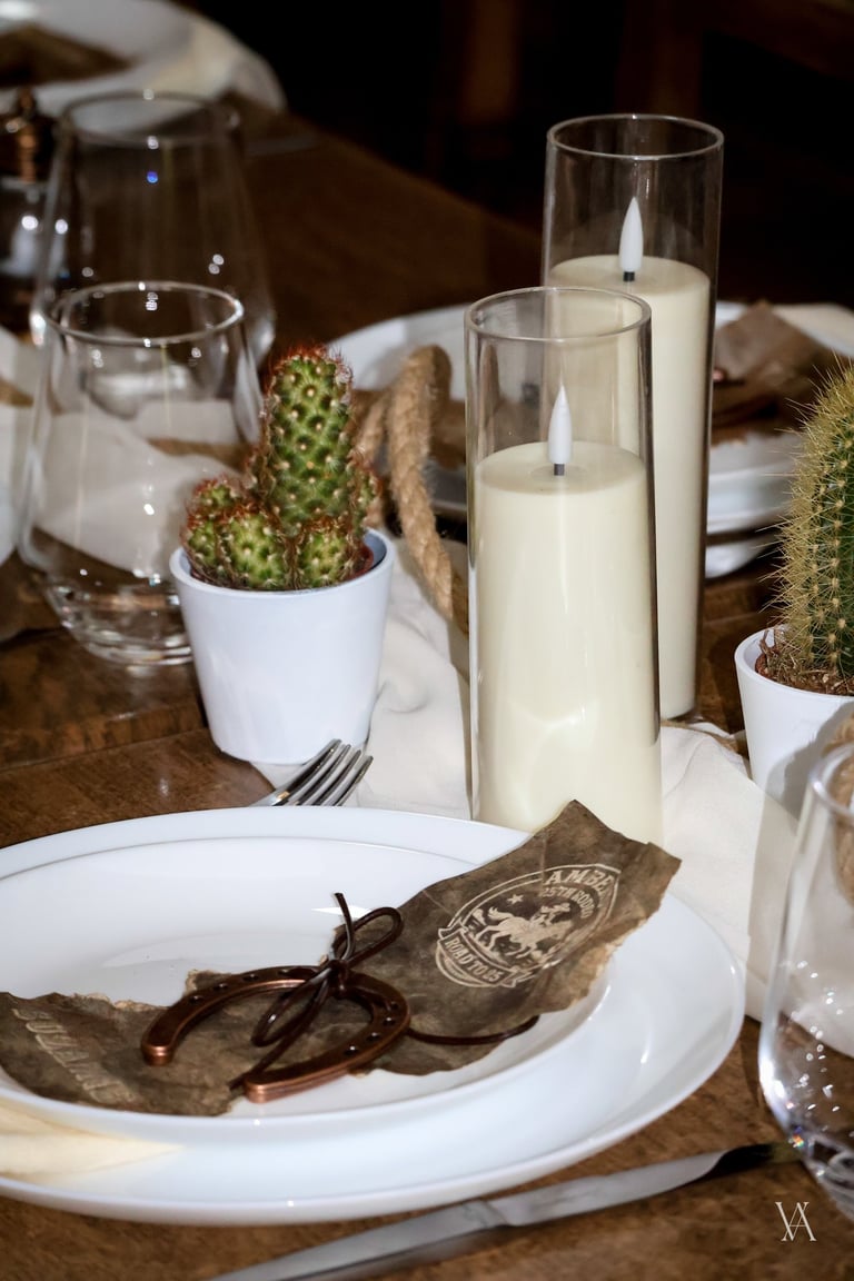 Autour du lieu, l’univers western se dévoile par touches : tonneaux, drapeaux, objets emblématiques et matières patinées évoquent l’esprit des grandes plainesAu centre, une longue tablée rassemble cactus, lassos, fers à cheval et lampes à huile. Les bougies viennent adoucir les lignes rustiques du décor, apportant une lumière chaude qui équilibre la force des matières. Concert de musique country, rodéo, lancer de lasso ou tir, l’expérience se prolonge naturellement dans les saveurs et les animations, pensées pour contribuer à transformer le lieu en un véritable décor vivant, où les invités plongent le temps d’un week end.